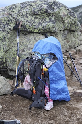 Little one is napping during a break, which happened to be on the summit of Little Haystack. She slept through us placing on the cover. Here is us on Mt. Lafayette…
